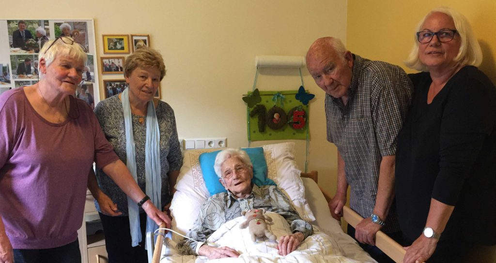 Knapp 60 Jahre später, am 27.5.2018, dem 105ten Geburtstag unserer Mutter. Von links: Gisela, Helga, Alwine, Eberhard, Irmgard