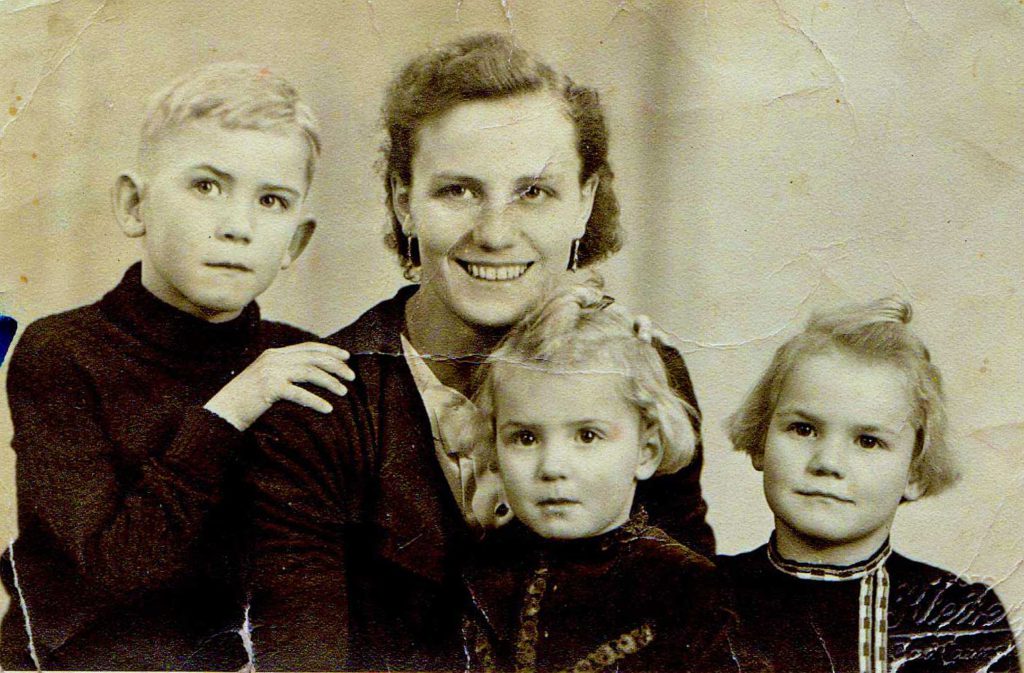 Für Gisela am 29.10.1937. Hier ist sie als kleine Maus (ganz rechts mit dem sogenannten Russenkittel) mit ihrer Mutter Alwine, Bruder Eberhard und Schwester Helga.
