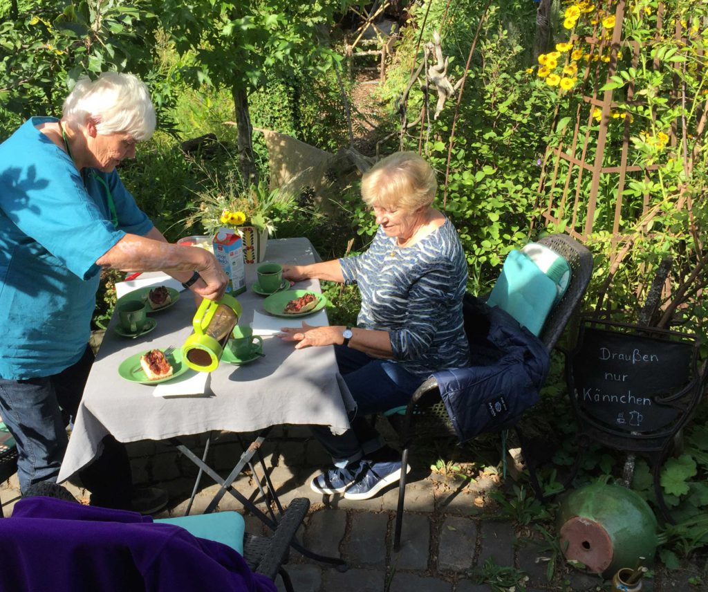 Ab dem 2. September hört sie auf zu essen, lässt sich aber mit etwas Apfelmus die Tabletten geben. Sie mag den Geschmack von Milchkaffee. Sie regelt mit ihrer Familie alles, ihren Tod betreffend. Auf meine Einlassung, ob ihr klar sei, dass sie durch Nicht-Essen ihren Tod beschleunigt, sagt sie ganz ruhig: „Ja, und das will ich ja auch.“ Und zwischendrin blitzt ihr alter Humor auf. Wir sprechen über Luise (Schwiegermutter) und Ludwig (Vater von Gustav, im Gegensatz zu seiner Frau ein herzensguter Mensch) und sie sagt: „Wisst ihr, dass ich Ludwig mit Vanillepudding gefüttert habe und er währenddessen gestorben ist?“ Dann blitzen ihre Augen, sie lächelt verschnmitzt und sie zeigt auf das Vanillepudding-Schälchen auf der Ablage und sie sagt zu uns: „Und wollt ihr das da mal wegnehemn?!“