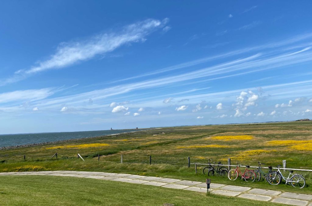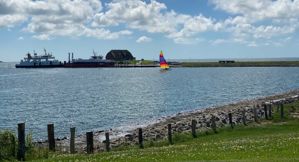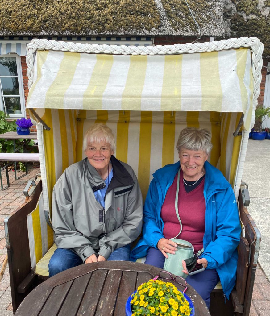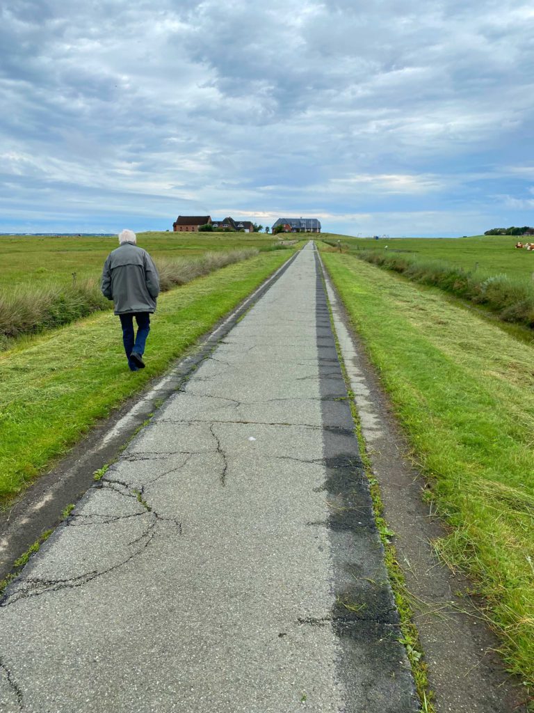 Dann kommt die Corona-Pause….aber die Reisegruppe Silberlocke plant weiter – und im Juni 2022 geht es endlich auf die Hallig Langeneß, auf die Tadenswarf. Dort hat die gesamte Gastfamilie Corona, managt aber das Ganze berührungsfrei: Wir gehen in den kleinen Laden, kaufen ein durch beherzten Griff ins Regal und am Ende wird von einem gerade mal Corona-negativen Familienmitglied abgerechnet. Das war genial. Wir hatten wunderbare Tage und bekamen sogar frische Nordseekrabben geliefert. Zu unserem Erstaunen war die Hallig sehr laut: ein riesiges Vogelgeschrei umgab das Haus. Gisela fand besonders witzig das Gegurgel der Eiderenten.