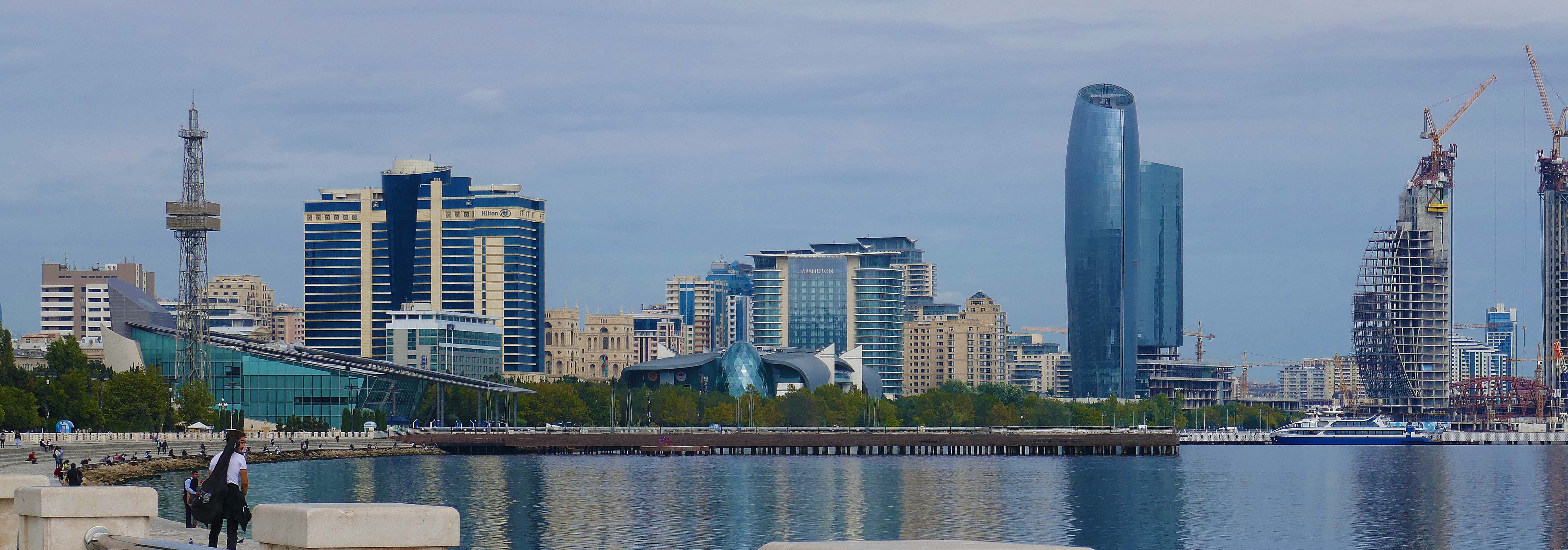 Baku, die Essenz aller Gegensätzte des Landes: Das Kaspische Meer, das sich uns etwas grau verschleiert und tatsächlich geringfügig nach Petrochemie riechend, darbietet, die 19./20. Jht-Architektur, die uns wie Paris an mancher Häuserecke vorkommt und die Gigantonomie der Moderne, die zum Teil wie liegengeblieben wirkt. Dazu die schöne Altstadt, die offenbar Stück für Stück restauriert wird und – das konnte ja nur ich nicht wissen! – die engen Straßen, durch die jedes Jahr , sozusagen um den Jungfrauenturm herum, ein Formel-1-Autorennen stattfindet.